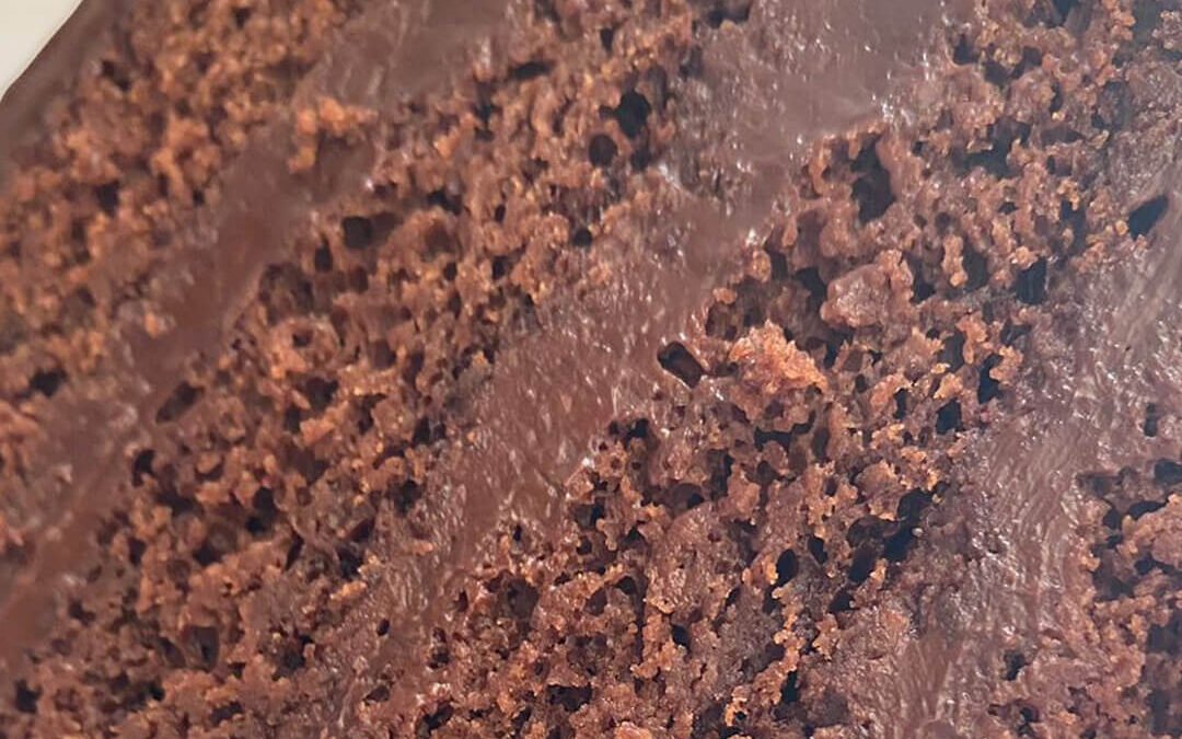 - Para decorar, intercalar una capa de torta con otra de ganache y cubrir todo el exterior de la torta también con ayuda de una espátula.